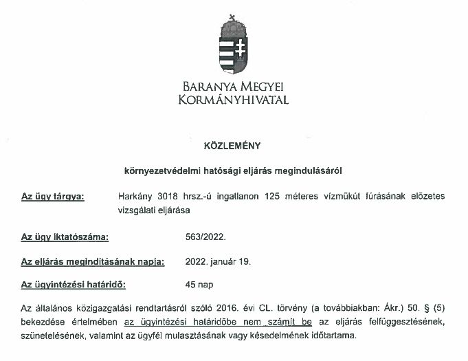 Az ügy tárgya: Harkány 3018 helyrajzi számú ingatlanon 125 méteres vízműkút fúrásának előzetes vizsgálati eljárása