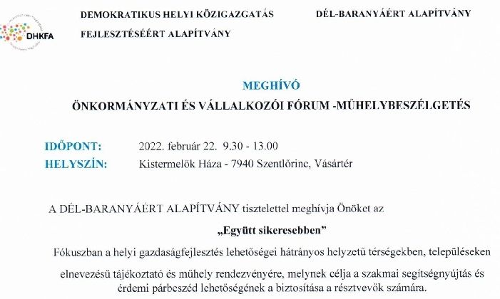 A DÉL-BARANYÁÉRT ALAPÍTVÁNY tisztelettel meghívja Önöket az „Együtt sikeresebben” Fókuszban a helyi gazdaságfejlesztés lehetőségei hátrányos helyzetű térségekben, településeken elnevezésű tájékoztató és műhely rendezvényére, melynek célja a szakmai segítségnyújtás és