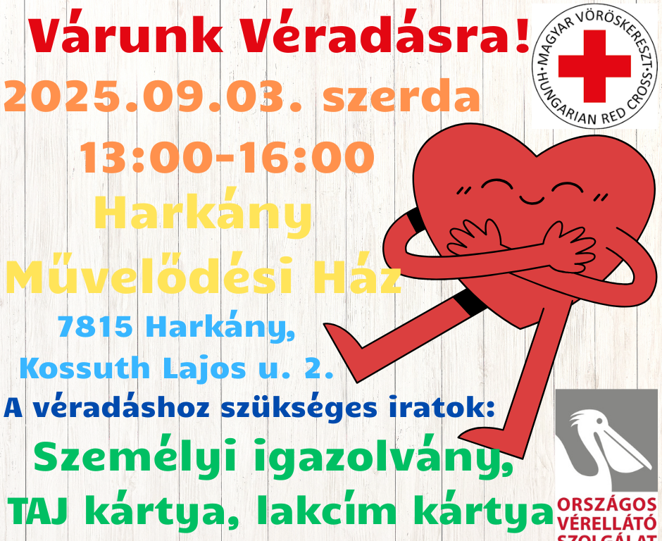 Helyszín: Művelődési ház 7815 Harkány, Kossuth L. u. 2. Időpont: 2025. szeptember 3. (szerda) 13:00-16:00 óráig