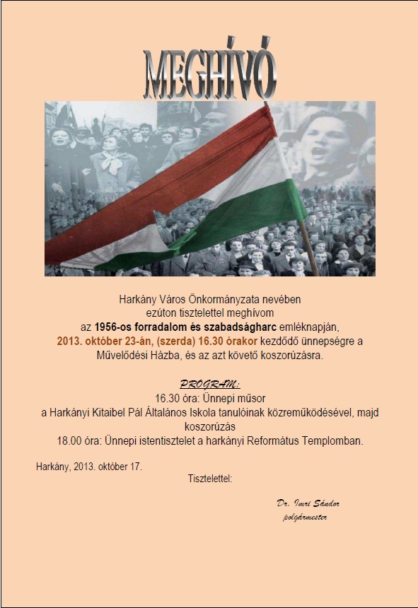 Harkány Város Önkormányzata nevében ezúton tisztelettel meghívom az 1956-os forradalom és szabadságharc emléknapján, 2013. október 23-án, (szerda) 16.30 órakor kezdődő ünnepségre a Művelődési Házba, és az azt követő koszorúzásra.