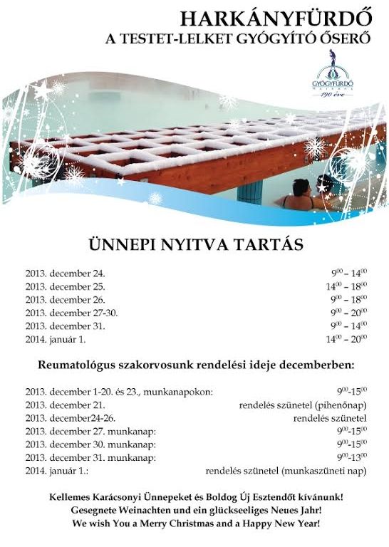 Kedves Harkányi lakosok! Ezúton tájékoztatjuk Önöket a Harkányi Gyógy- és Strandfürdő ünnepi nyitva tartásáról.