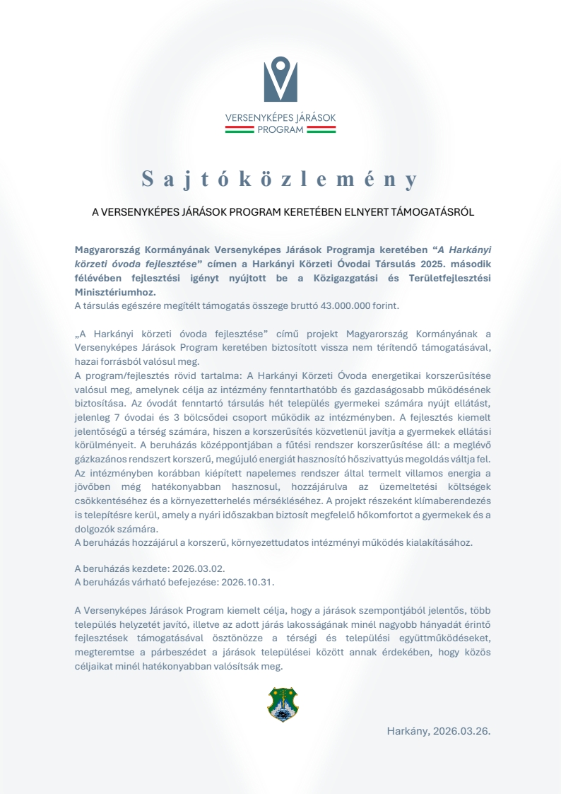 SAJTÓKÖZLEMÉNY - A Versenyképes Járások II program keretében elnyert támogatásról